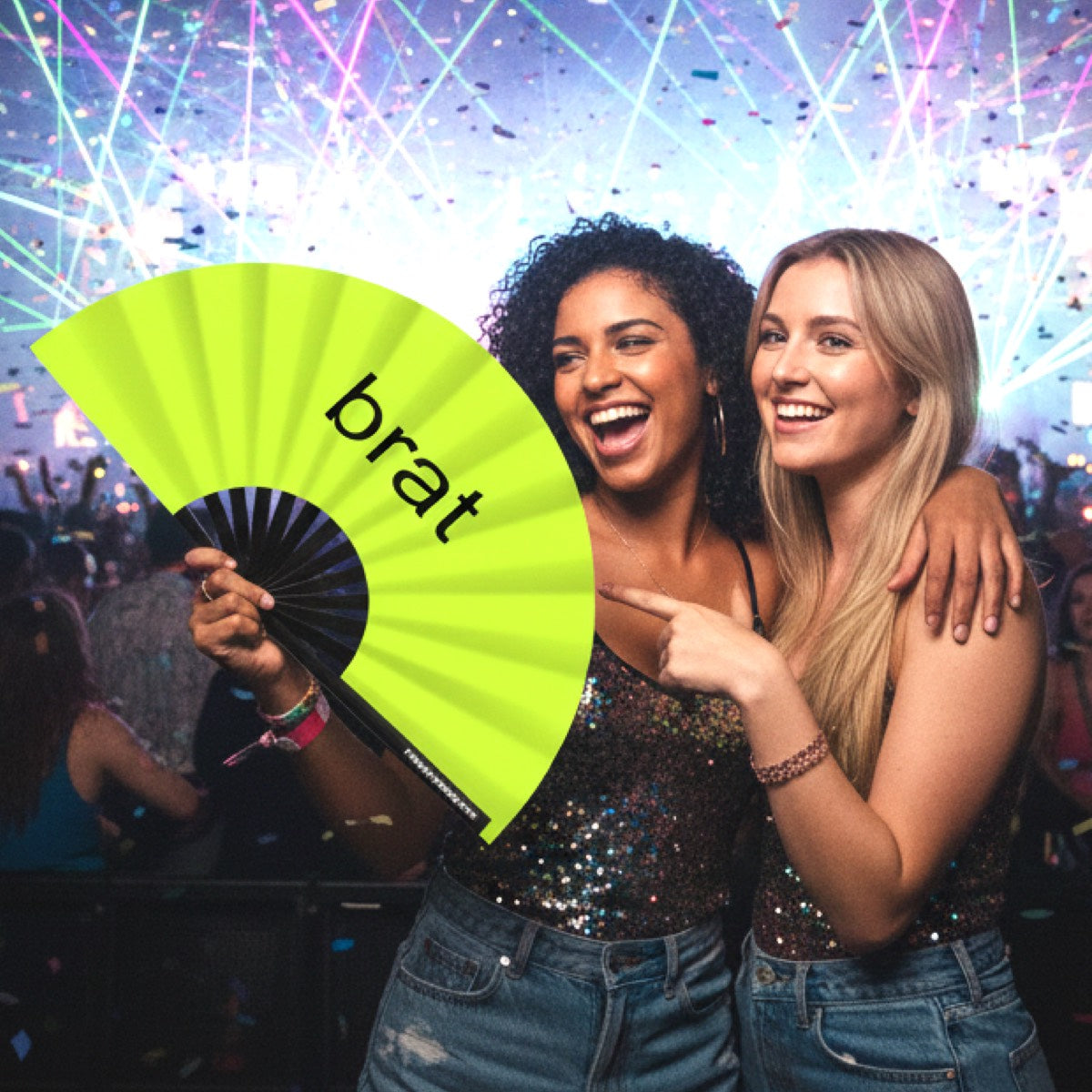 • Design: Full-color, distinctive green folding fan with "Brat" attitude.