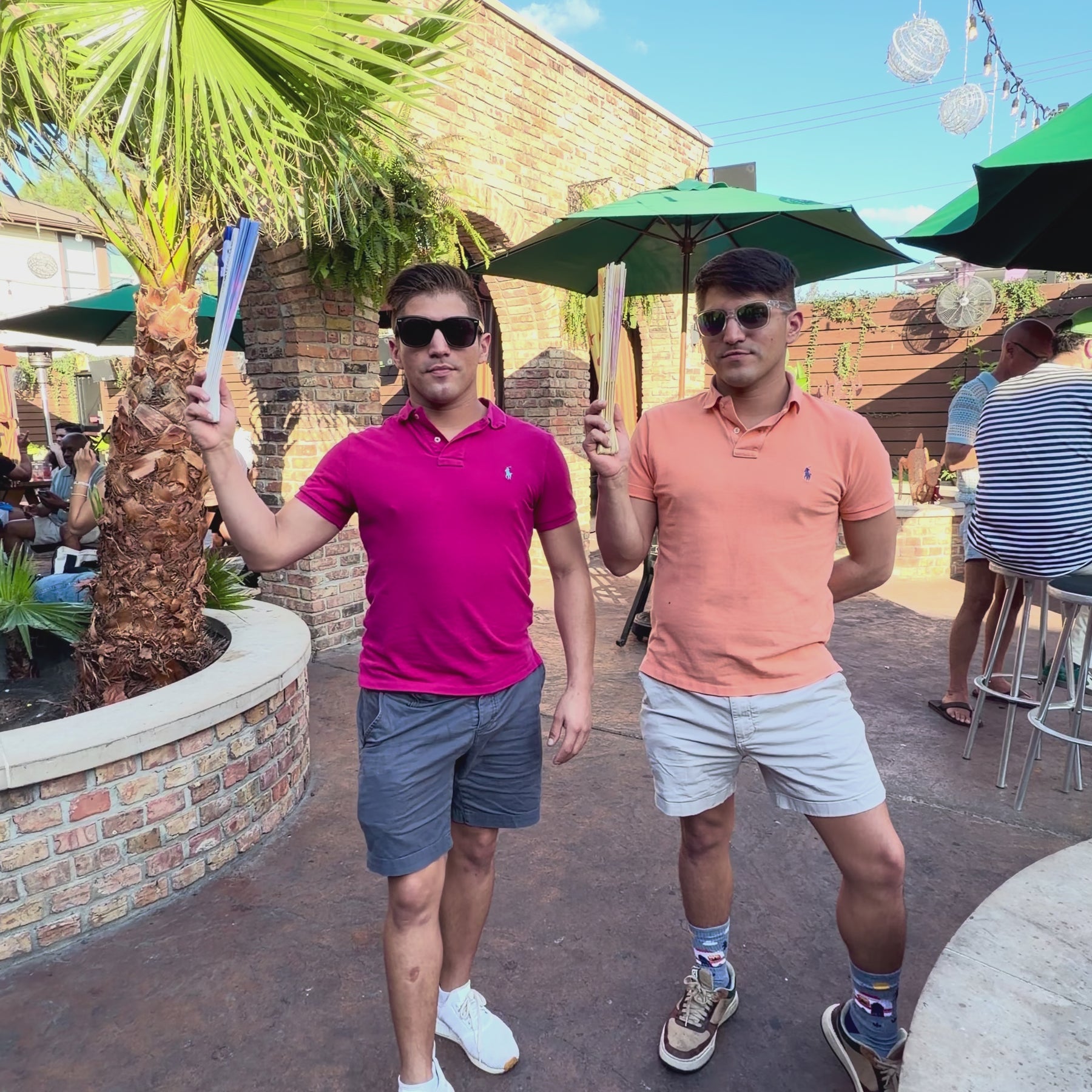 Gay twins holding two funny statement clack fans from The Gay Fan Club the "looking for a sugar daddy" and "Slut Era" fans