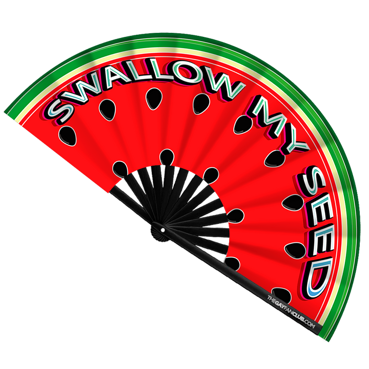 Der Wassermelonenfächer (UV) eignet sich hervorragend für Raves, Festivals, Poolpartys und Picknicks. Mit seinem rot-grünen Wassermelonen-Design und der verspielten Botschaft „Swallow My Seed“ ist dieser Bambus-Handfächer ein echter Hingucker. Passen Sie bei Familienaktivitäten auf!