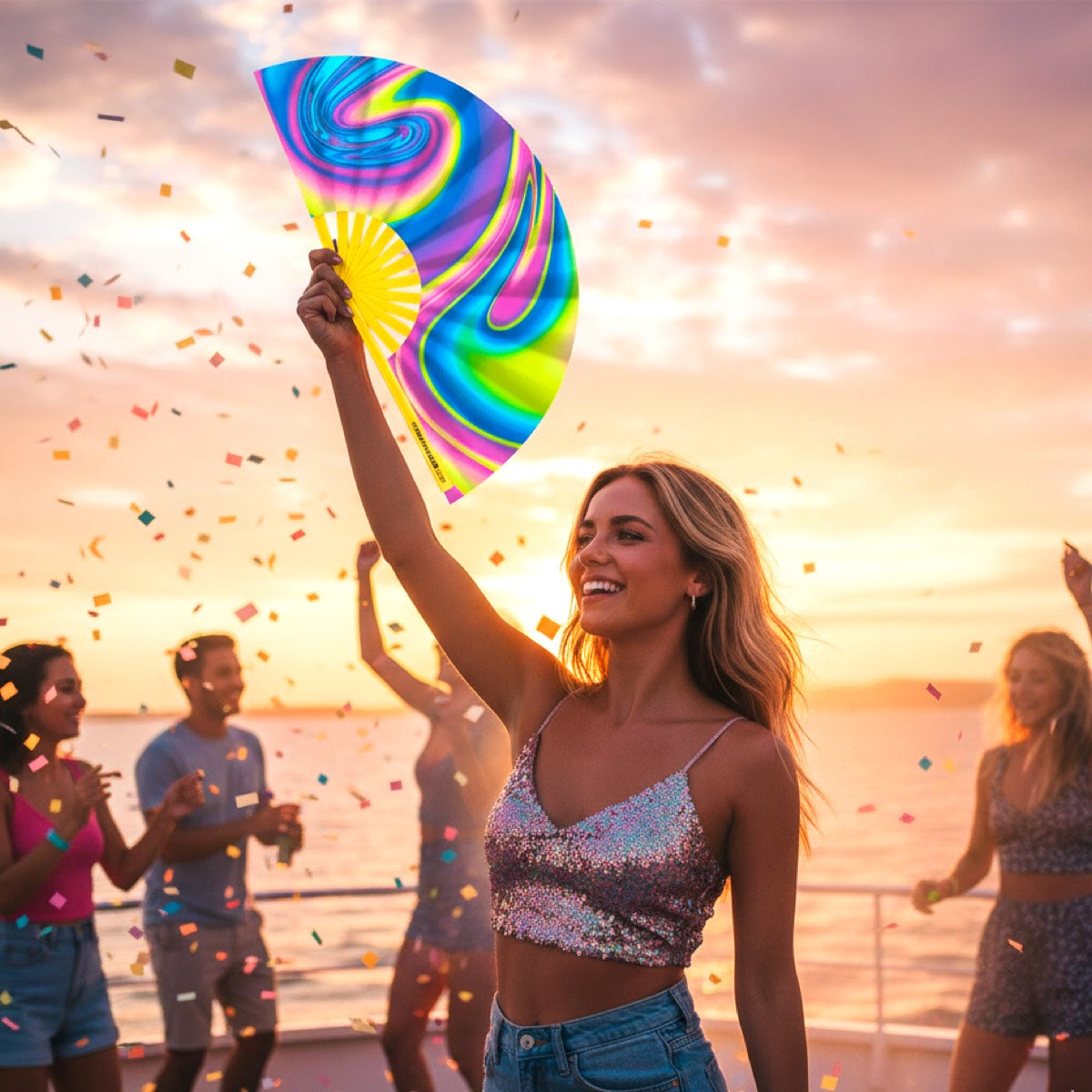 • Psychedelic Glow: The unique design is UV-reactive, ensuring your fan swirls and glows brilliantly on the darkest dance floors.