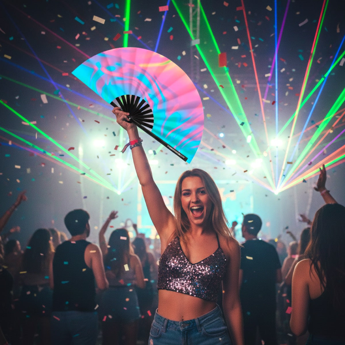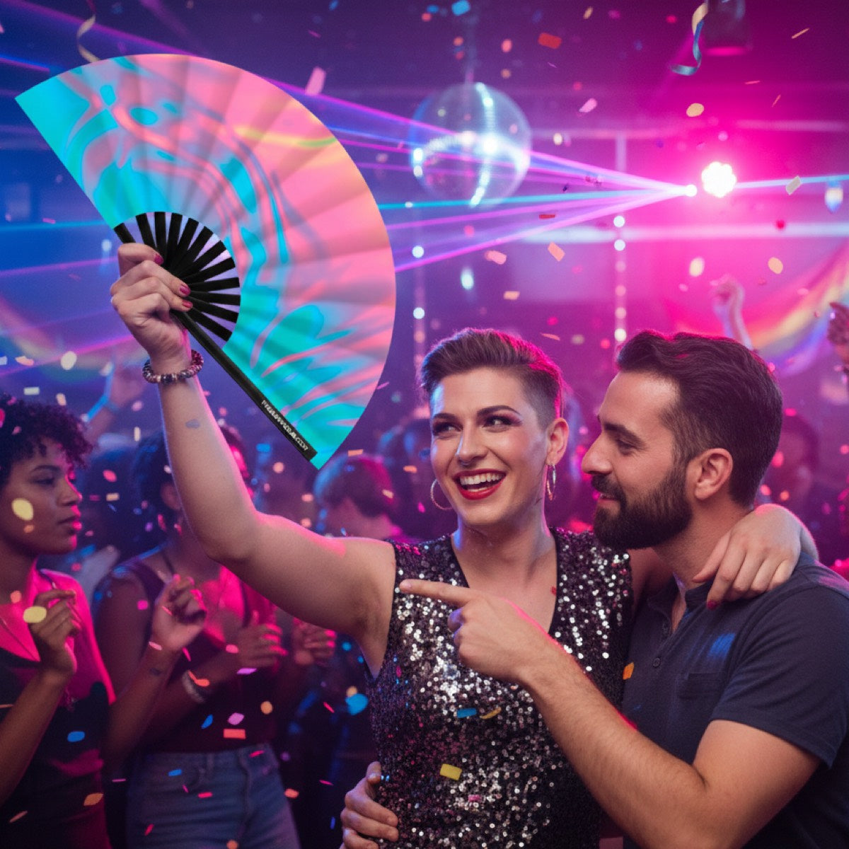 Flow with confidence and light up every room. The Fluid Fan (UV) is a visual tribute to the beauty of identity, change, and celebration. With its radiant swirls of blue and pink, this fan is a popular choice within the Trans and Gender-Fluid communities, as well as a favorite for anyone who lives life in full color. This fan is designed to glow brilliantly under blacklight, transforming your movement into liquid light on the dance floor.
