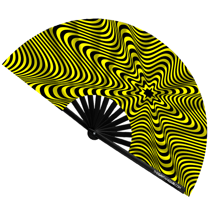 Oversized UV-Reactive Yellow and Black Bamboo Clack Fan for Raves & Festivals